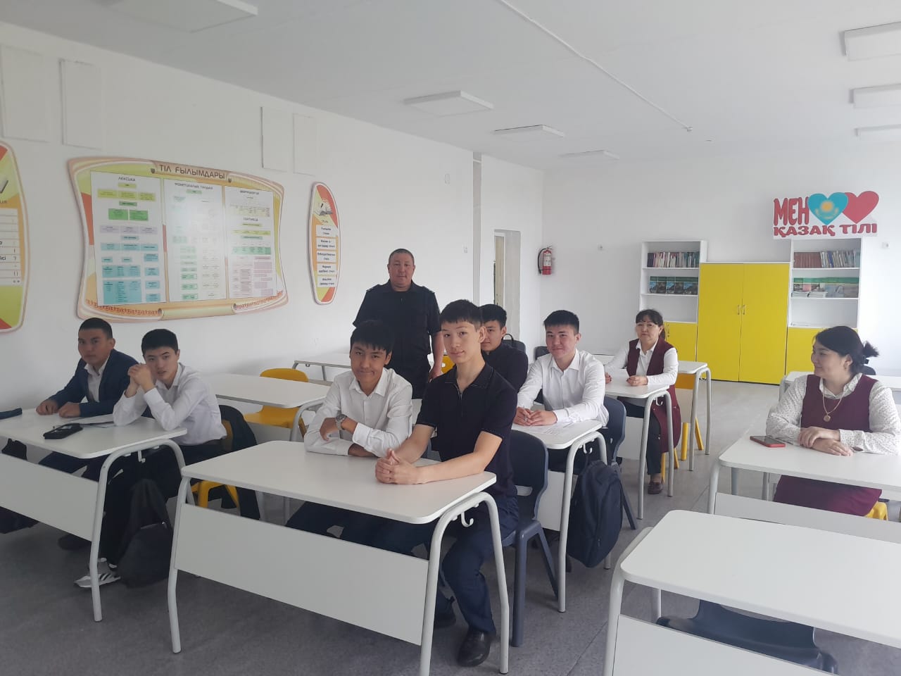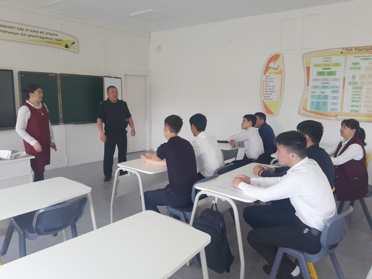 Кездесу барысында құқық қорғау саласындағы мамандықтар туралы айтып, оқушыларға пайдалы кеңестер мен мотивация берді.